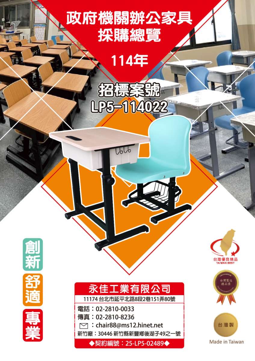 永佳工業有限公司為 114 年度政府機關辦公家具採購案之合格製造供應商,契約編號為 25-LP5-02489。